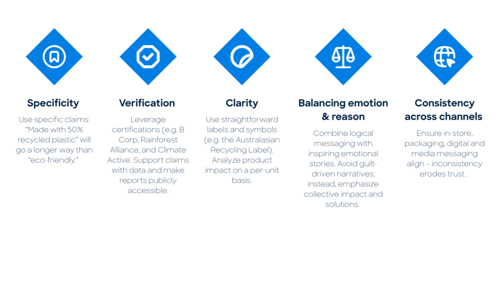 • Use specific and credible sustainability terms like ‘carbon neutral’ or ‘carbon reduction’ instead of vague language like ‘eco-friendly’, which is more often associated with greenwashing.