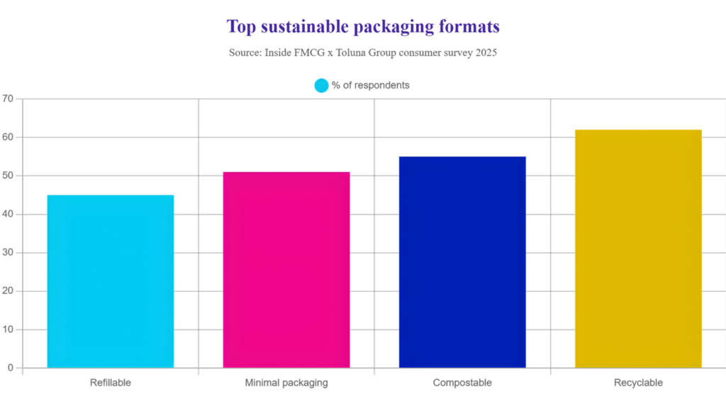 When asked to select the most important sustainability-related aspects of packaging, consumers prioritized recyclable packaging, compostable materials, and minimal packaging volume.